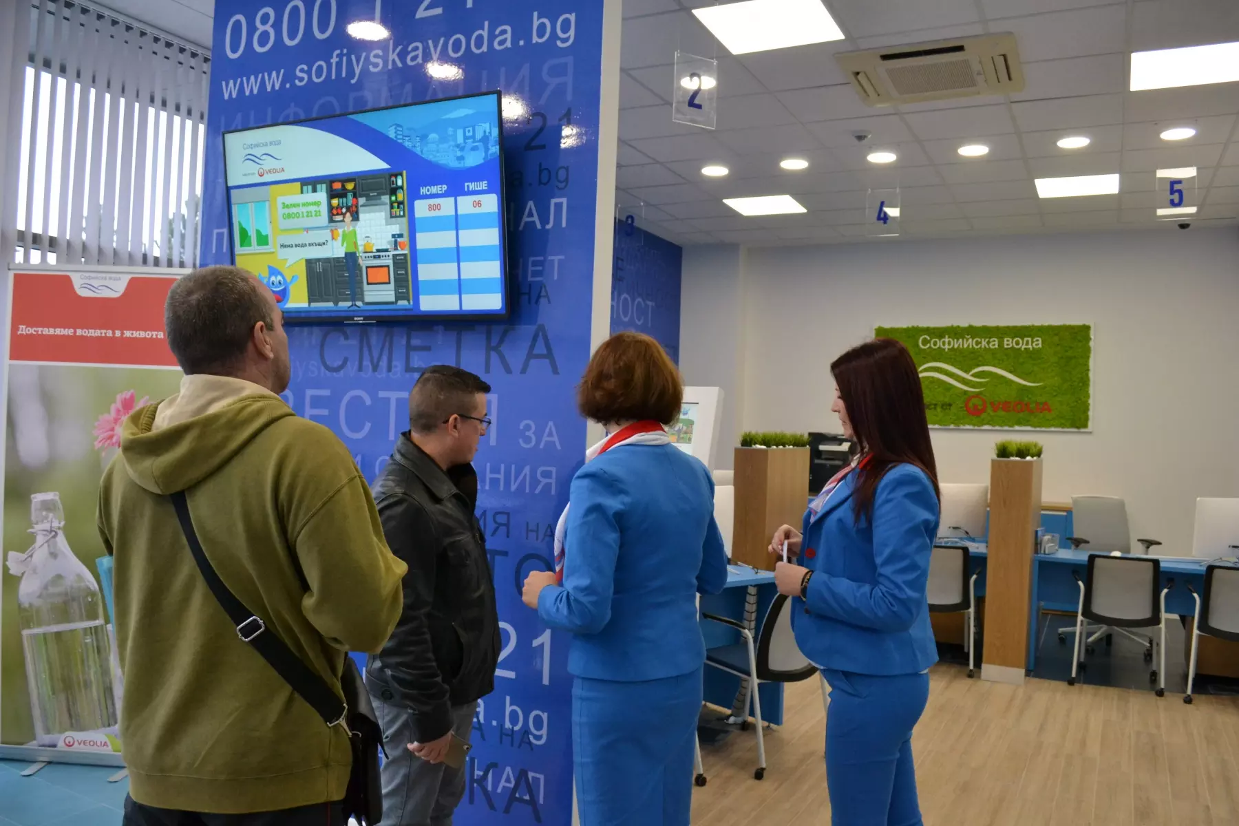In the new Customer Service Centers Sofiyska Voda provides functional separation of the offered services for customer convenience. There are designated desks for payment of bills and other fees, for provision of quick services and information, and for requests of service by customers, which require more time for processing. An electronic queue management system has been integrated, as well, which in addition to providing tickets with numbers to the customers, has digital video content as well.